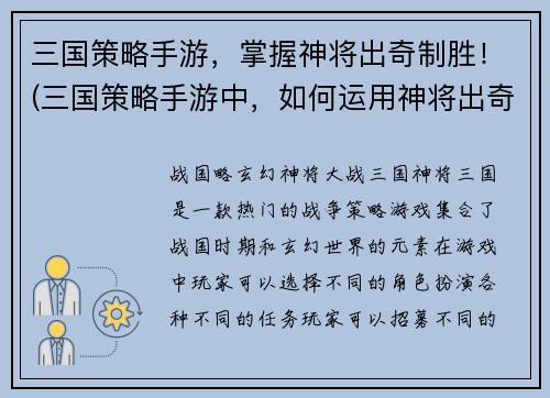 挥旗升起!三国英雄重聚战天下《三国群英传7》是一款以三国为背景的战略游戏。在游戏中,玩家可以自由选择自己喜欢的英雄,组建自己的团队,进行战略性的战斗。本文将介绍该游戏的几个亮点。 核心内容:战斗系统和...
